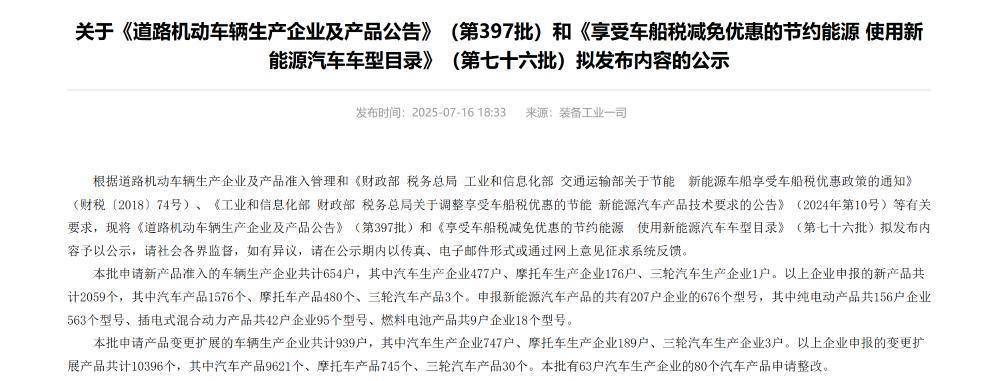 工信部发布第397批《道路机动车辆生产企业及产品公告》