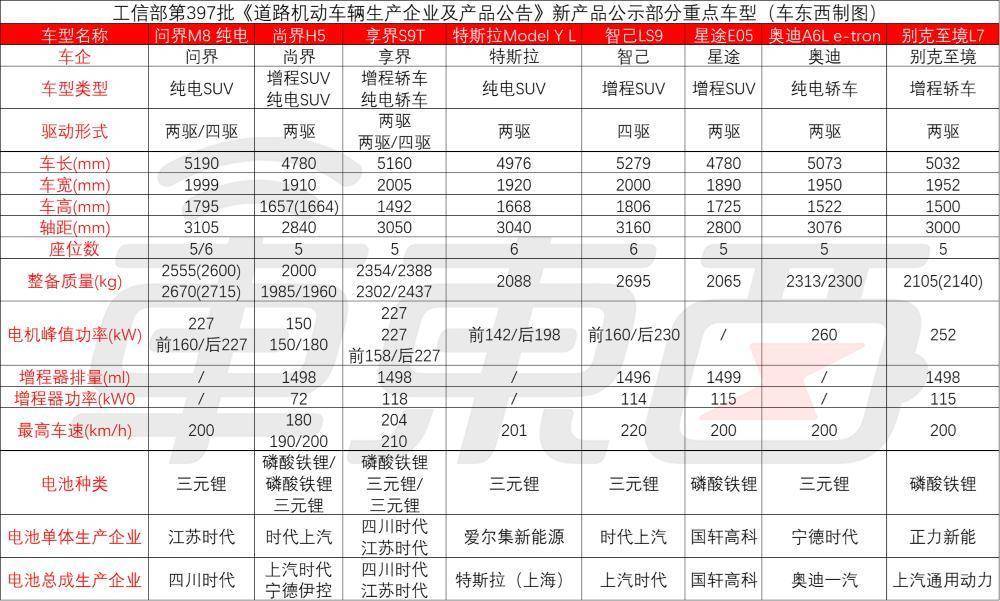 工信部第397批《道路机动车辆生产企业及产品公告》新产品公示部分重点车型