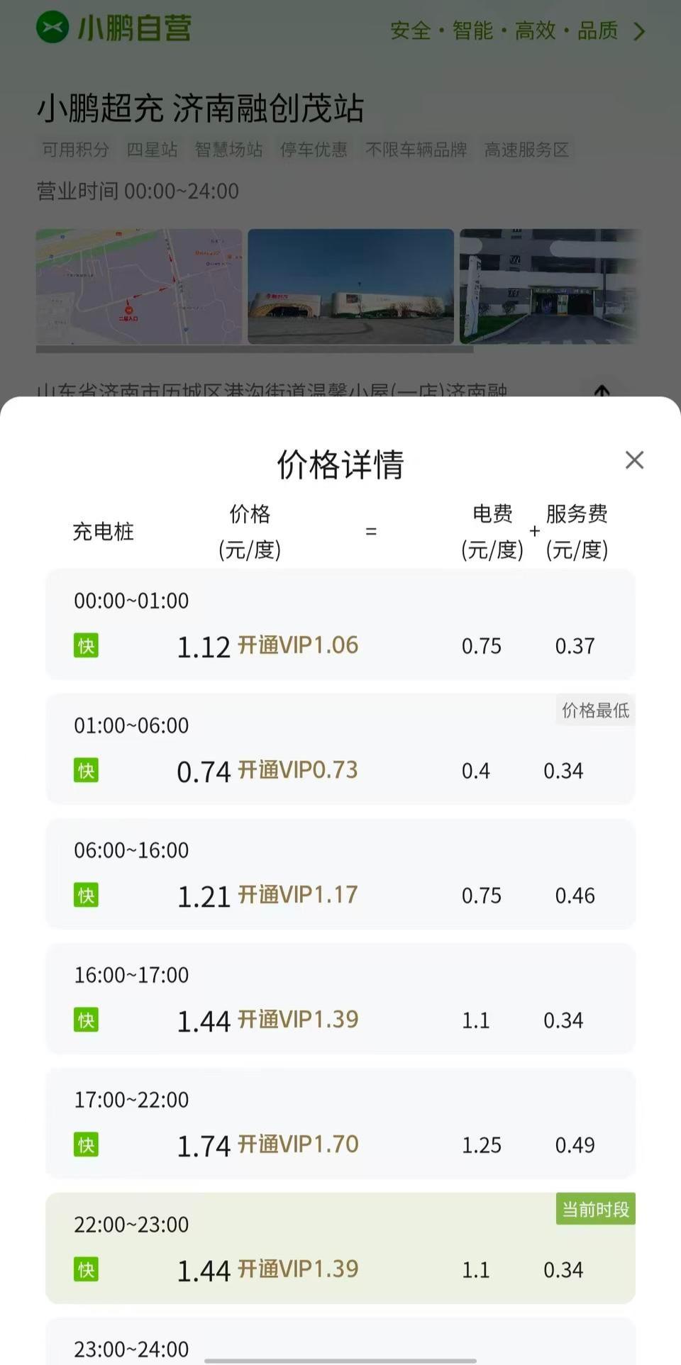 以小鹏超充(济南融创茂站)充电桩为例,高峰时段的充电电价约为每度电1.44-1.74元(包含基础电费及一定服务费,不同地区会有所差异);平段电价约为每度电1.21-1.44元;低谷时段电价则每度电在0.74-1.04元左右。