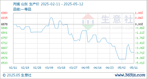 原料端:原料丙烯市场价格上调,对环氧丙烷市场有一定支撑。据生意社行情分析系统显示,截止到5月12日,生意社丙烯基准价为6630.75元/吨,与本月初(6570.75元/吨)相比,上涨了0.91%。