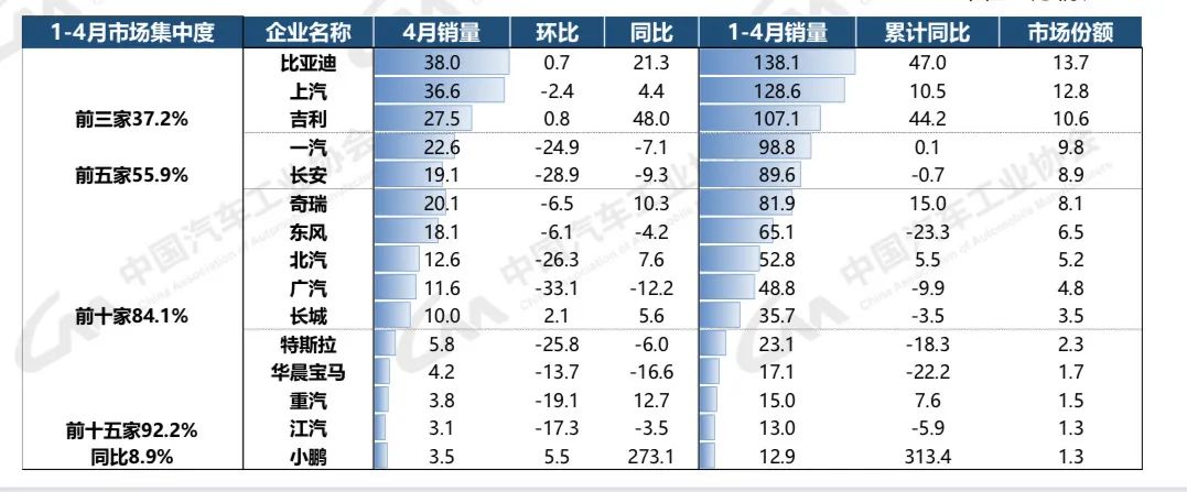 在车企方面,根据中汽协统计,1—4月,汽车销量排名前十位的企业(集团)共销售846.4万辆,占汽车销售总量的84.1%。在汽车销量排名前十位企业中,与上年同期相比,长安汽车(000625)、东风公司、广汽集团(601238)和长城汽车(601633)销量呈不同程度下降,其他企业销量均呈不同程度增长,其中比亚迪(002594)和吉利控股增速更为显著。