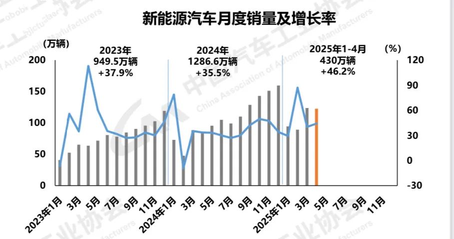 2025年1—4月,中国新能源汽车产销累计完成442.9万辆和430万辆,同比分别增长48.3%和46.2%,新能源汽车新车销量达到汽车新车总销量的42.7%。在新能源汽车主要品种中,与上年同期相比,燃料电池汽车产销呈两位数下降,其他两大类新能源汽车品种产销快速增长。